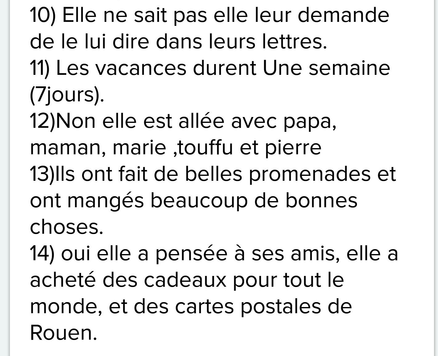 10) Она не знает, что просит их рассказать ему в своих письмах. 11) Отпуск длился неделю. 13) Они хорошо гуляли и ели много хорошего. 14) да, она думала о своих друзьях, она покупала подарки для всех и открытки из Руана.