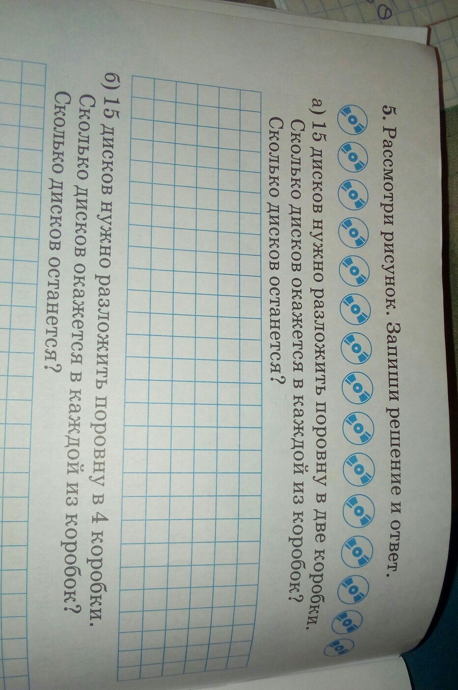 15 дисков нужно разложить поровну в две коробки сколько дисков окажется в каждой из коробок сколько дисков останется