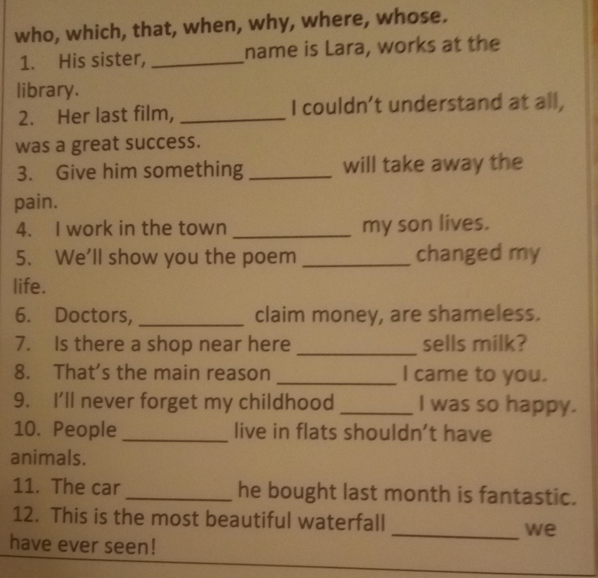 1 whose 2 which 3 that 4 where 5 which 6 who 7 which 8 why 9 when 10 who 11 which 12 which/ that