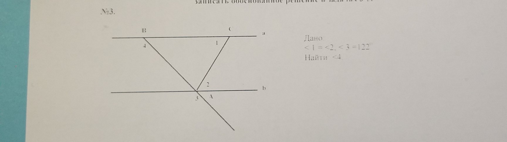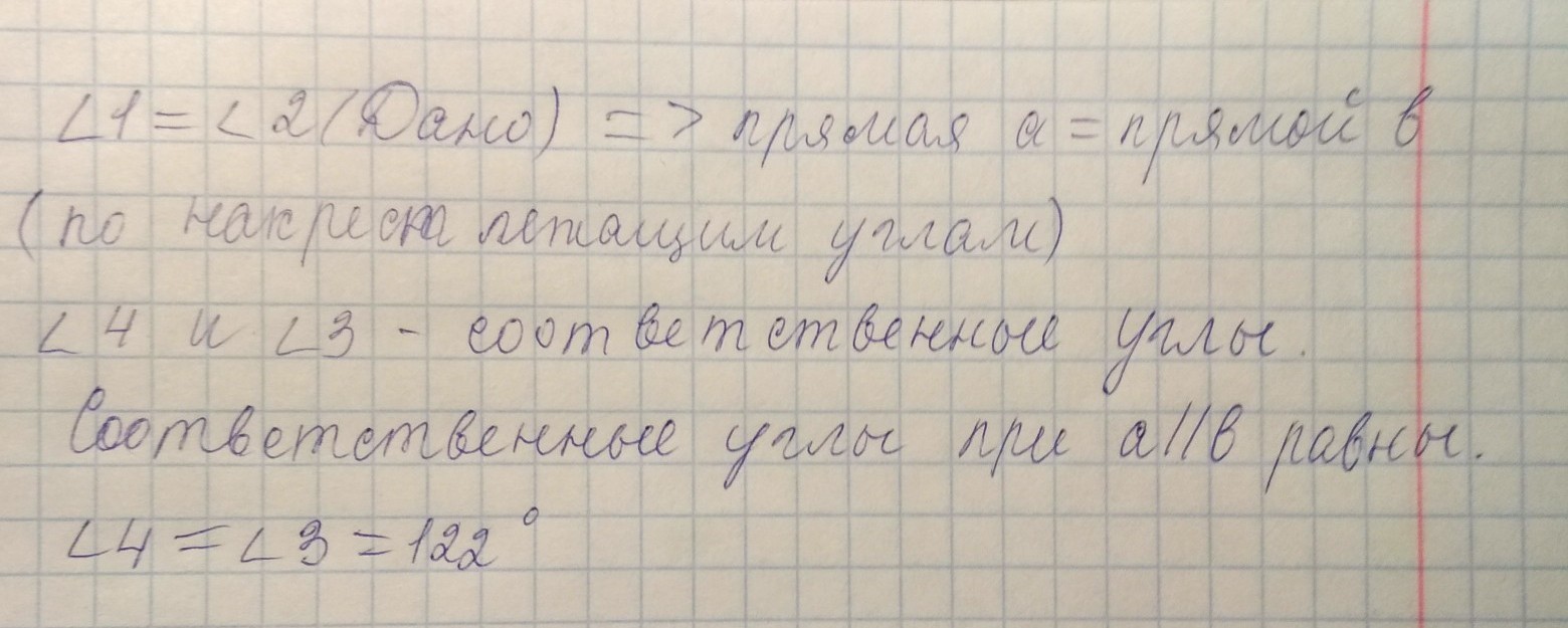 Смотри, угол 1 и угол 2 равны, как накрест лежащие, следовательно прямые а и b параллельны. Следует что угол 4 равен углу 3, и равен 122°.