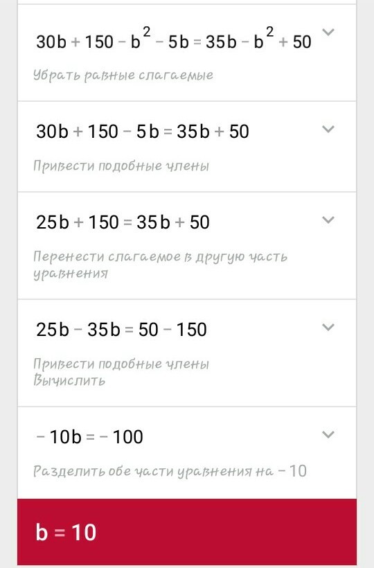 4)перенести слагаемое в левую часть равенства: 25b+150-35b-50=0