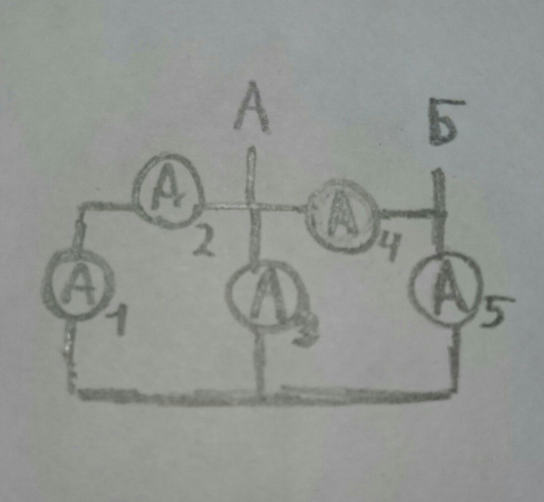 Будем двигаться из т.А : через амперметр А2 и А1 протекает ток 2мА. Сопротивления А1+А2 будут больше А3, не намного поэтому ток через А3 будет примерно 2.2мА. Эти амперметры включены паралельно, значит сумарный ток = А5 и равен 2мА+2.2мА=4.2мА.