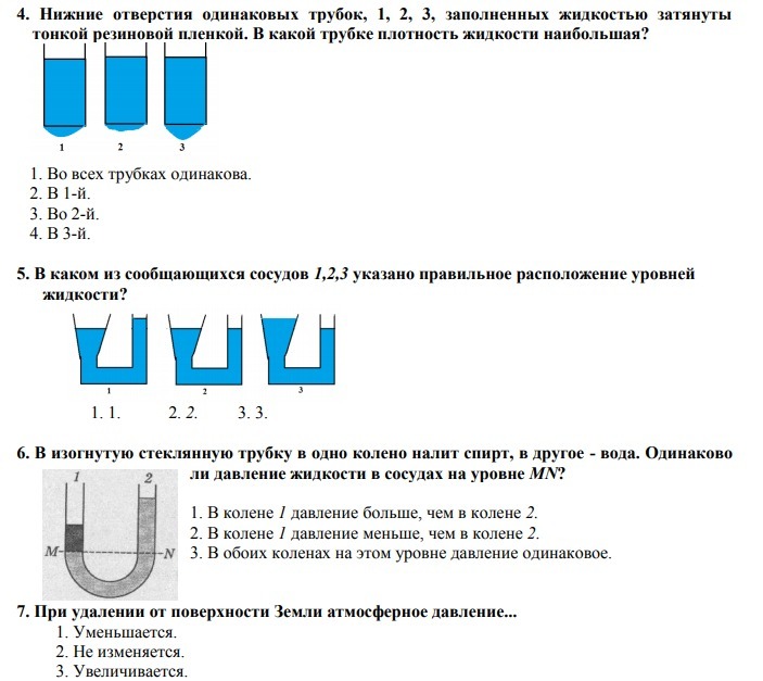 6. одинаковое -ответ 3; по условию равновесия вес столба воды (слева) и столба спирта равны, ро(воды)>ро(спирта), h(воды)<h(спирта), и давление одинаково