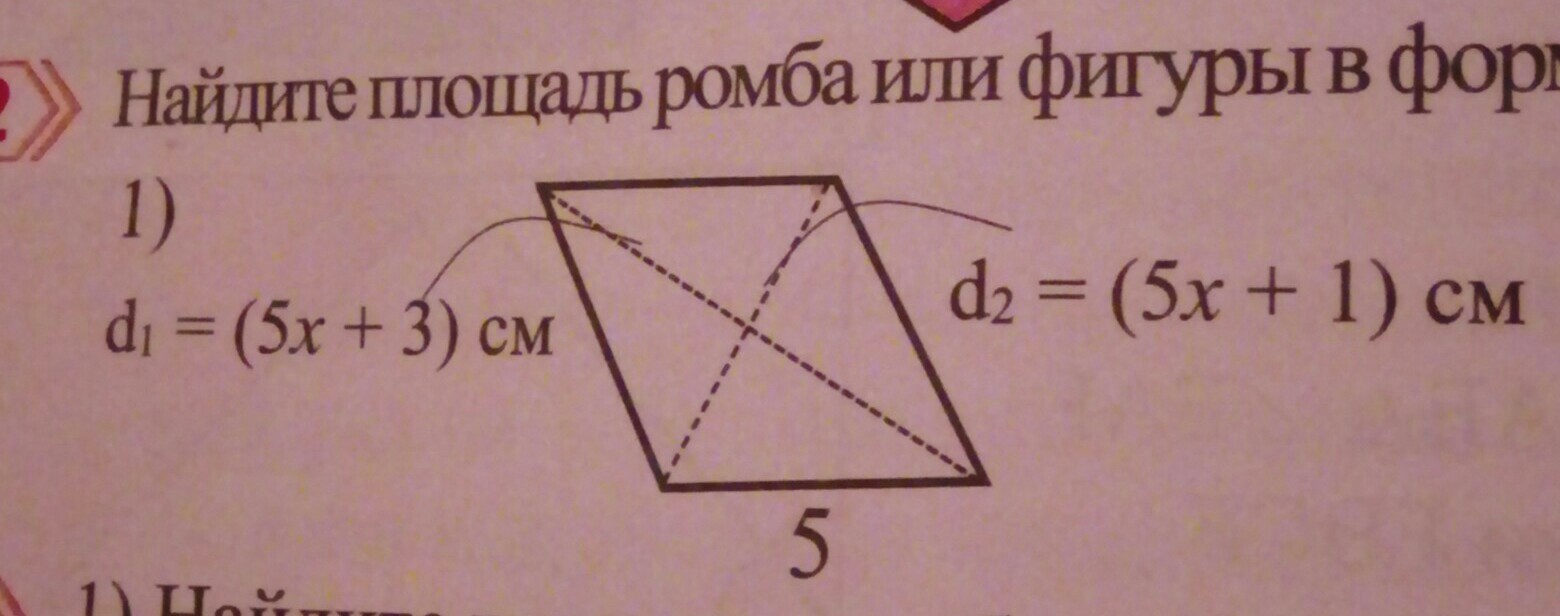 Найдите Площадь ромба если диагонали равны (5х+3) см. и (5х+1) см, а одна из сторон 5см.