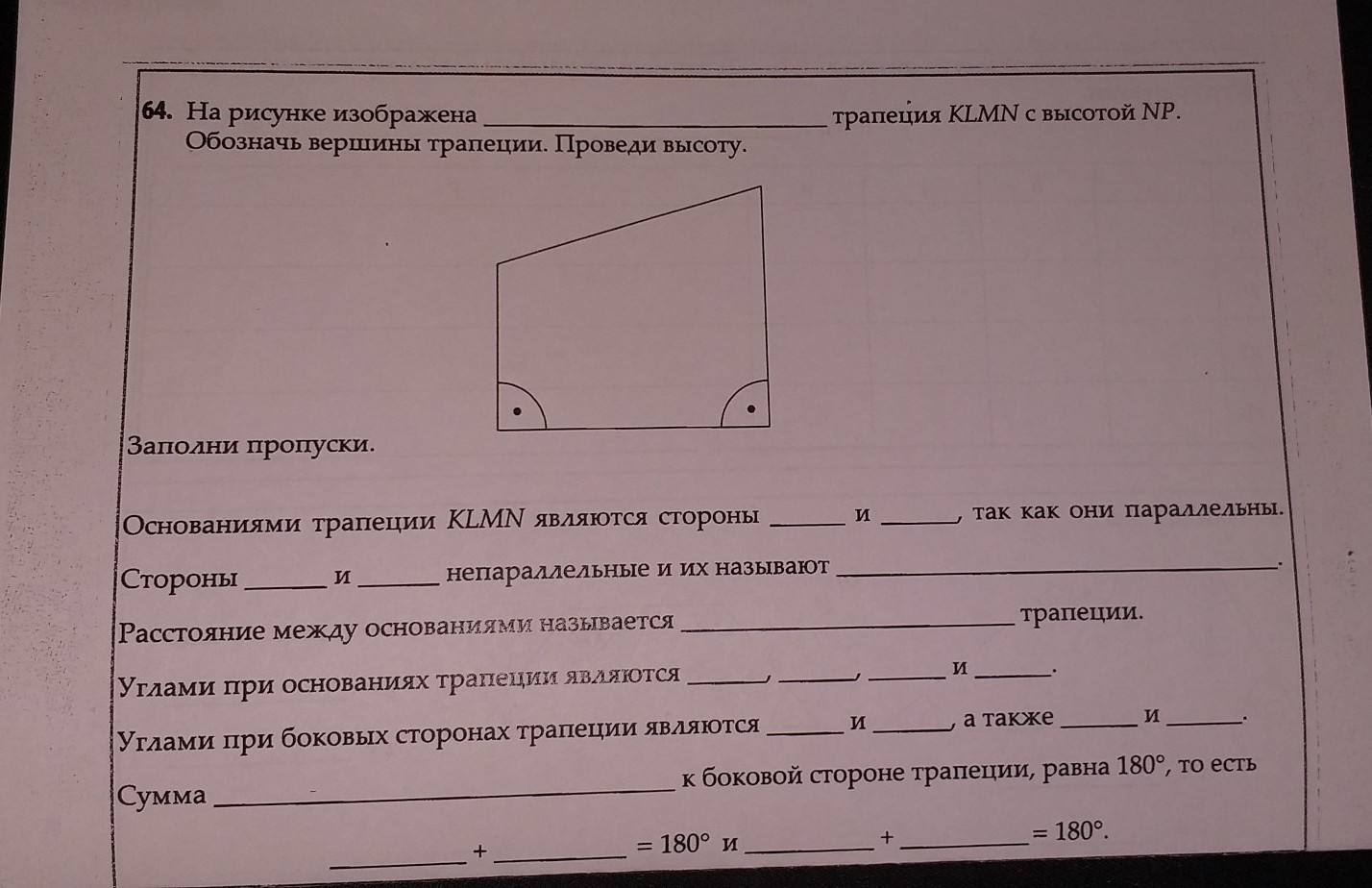 Углы при боковых сторонах: ∠L, ∠M и ∠N, ∠K