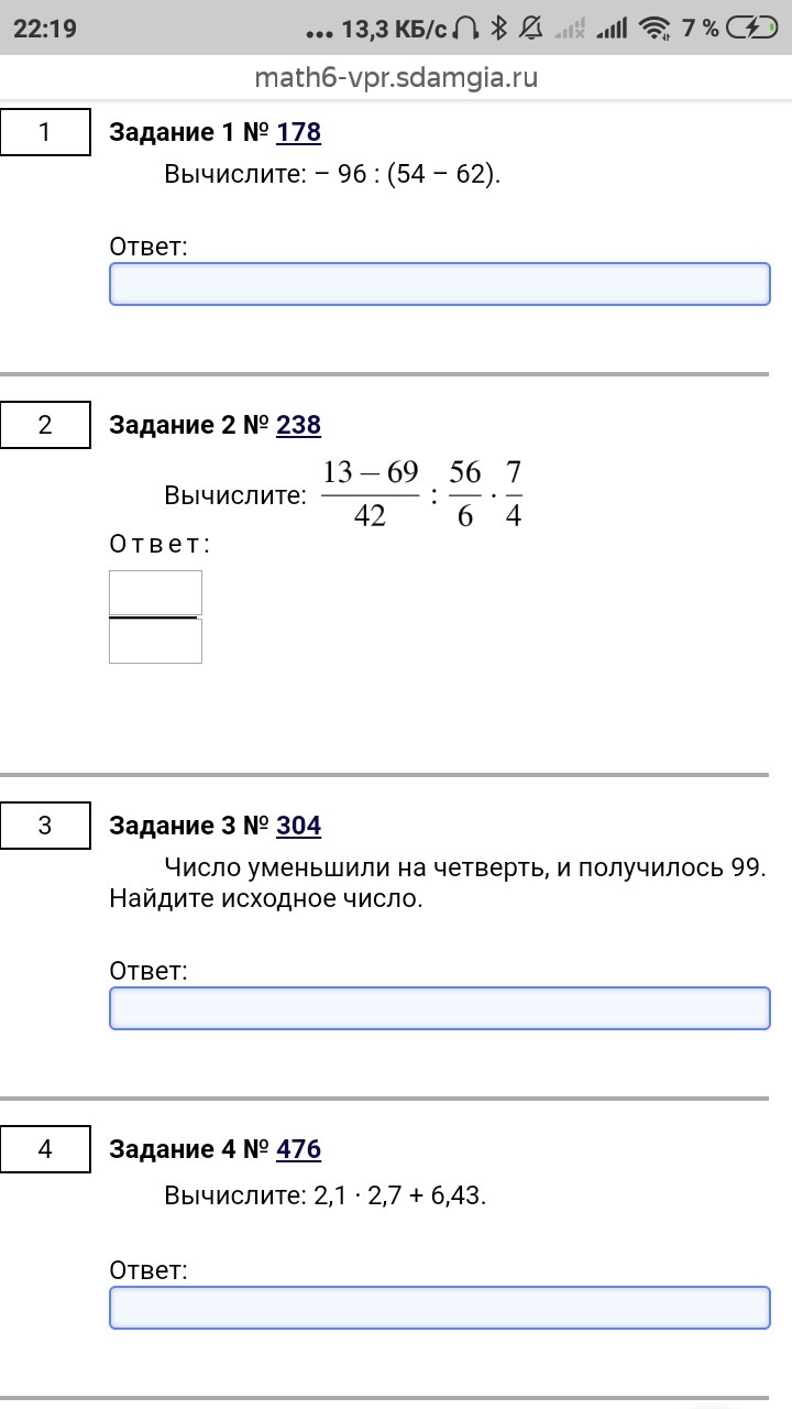 2. 13-69/42 : 56/6 * 7/4=-1/4