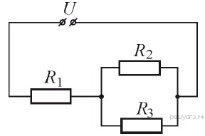 Вычислите, какова мощность электрического тока, проходящего через резистор R1 (см. рисунок). Электрические сопротивления резисторов равны соответственно R1 = 10 Ом, R2 = 40 Ом, R3 = 40 Ом. Постоянное напряжение U = 120 В