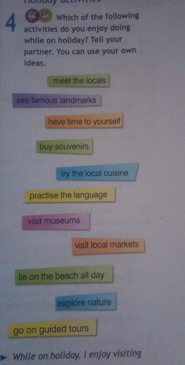 While on holiday, I enjoy seeing famous landmarks. I also like going on guided tours and visiting museums. If I want to buy souvenirs, I go to local markets. I don't like lying on the beach all day long. It is boring for me. It is more interesting to meet the locals and practise the language.