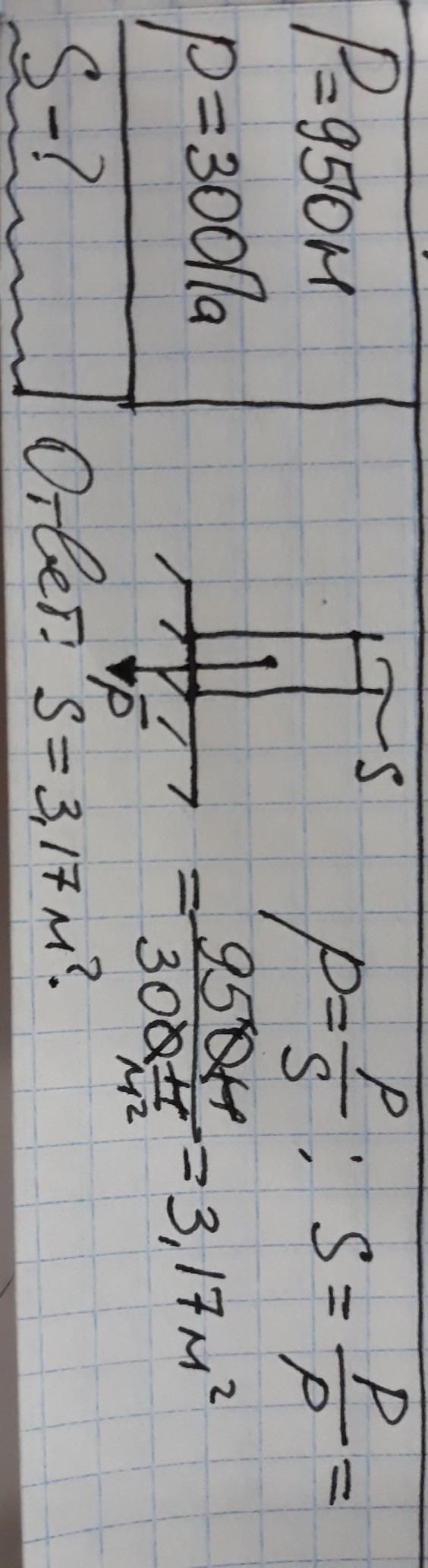 Определите площадь опоры столба весом в 950Н,если он показывает давление на пол в 300П.Помогите!