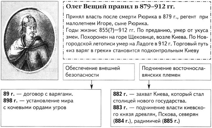 1)объединение восточно-славянских земель под его властью. Поход из Новгорода на Киев, взятие Киева, Смоленска, Любича. Убийство Аскольда и Дира.