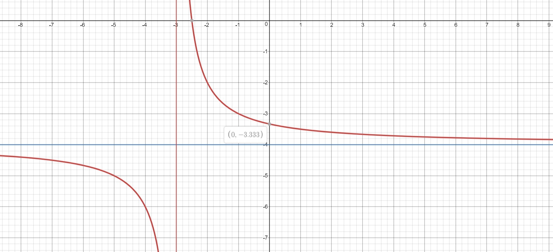 Это гипербола, её первая асимптота задаётся уравнением y=-4, а вторая x=-3. Коэффициент 2 сверху дроби говорит о том, что гипербола будет чуть дальше от пересечения её асимптот. Гипербола располагается в 1 и 3 четверти относительно асимптот, а не осей x,y. Найдём пересечения это функции с осями x,y.