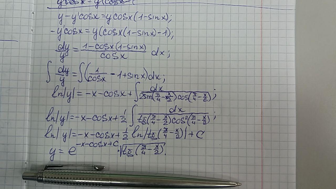 Определить тип дифференциального уравнения первого порядка и найти его общее решение: y-y'cosx=ycosx(1-sinx)