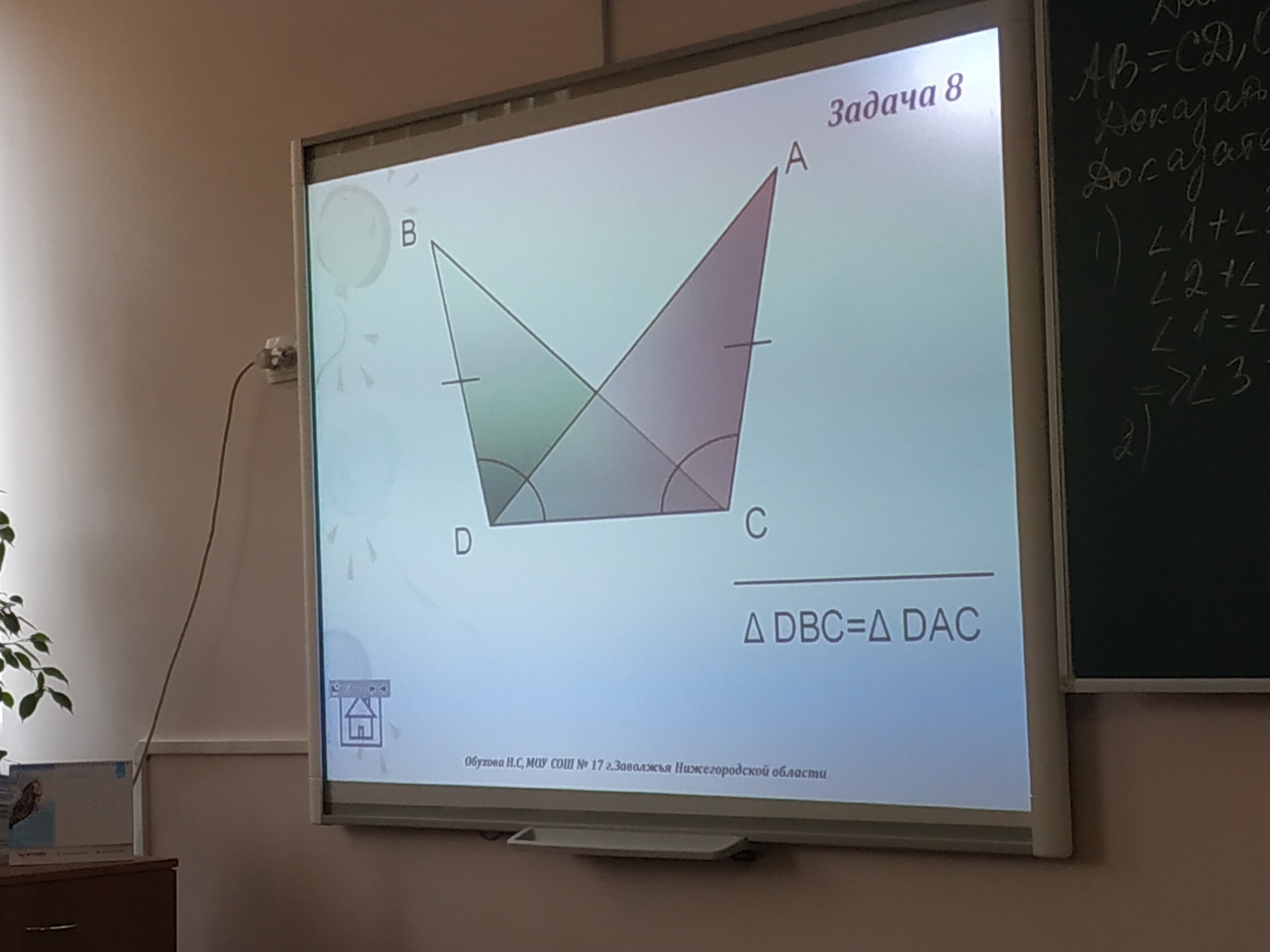 угол BDC = углу ACD отсюда следует , что треугольник DBC = треугольнику DAC по I признаку (по двум сторонам и углу между ними )