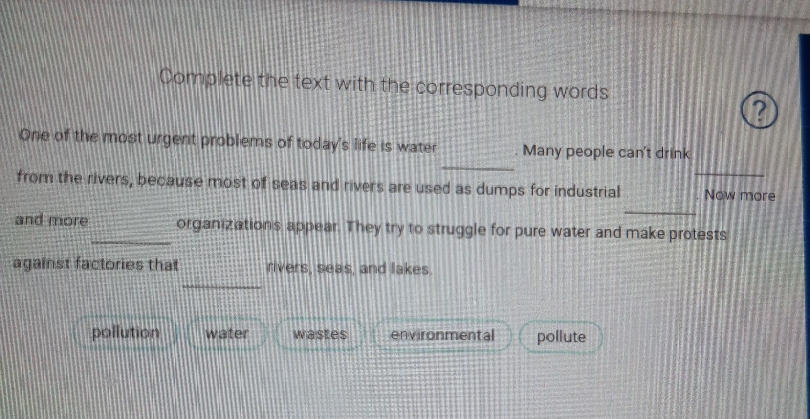 1.Pollution, 2. water, 3. wastes ,4. environmental, 5. pollute.