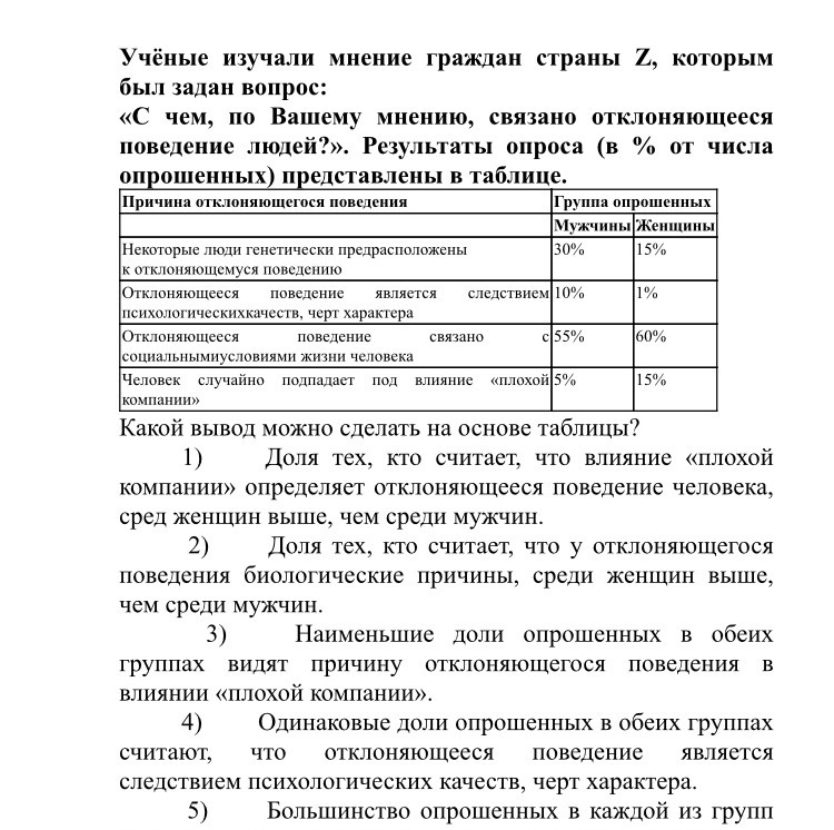 «С чем, по Вашему мнению, связано отклоняющееся поведение людей?». Результаты опроса (в % от числа опрошенных) представлены в таблице.