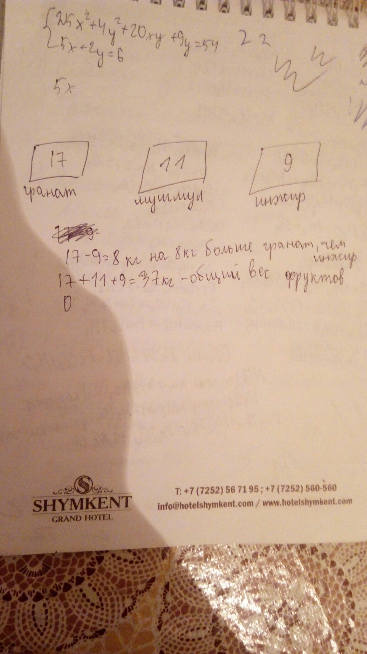 17-9=8кг-гранат тяжелее инжир. 17+11+9=37кг-общий вес