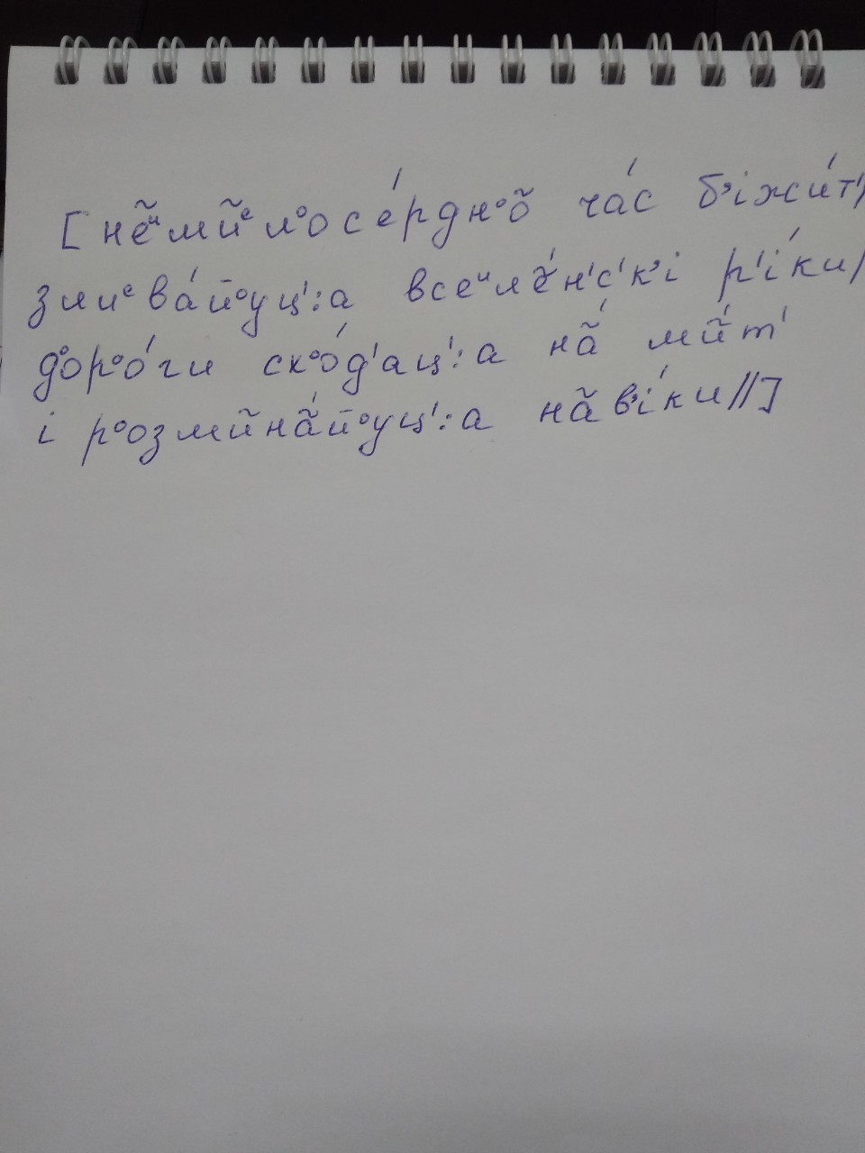 Немилосердно час біжить, Зливаються вселенські ріки, Дороги сходяться на мить І розминаються навіки. транскрипція
