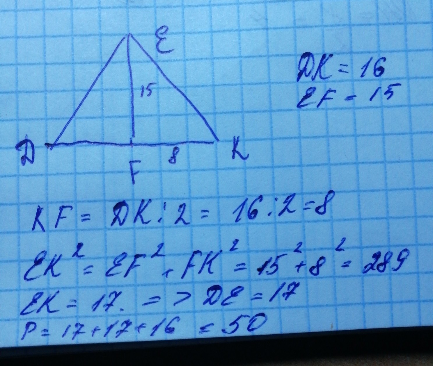 в равнобедренном треугольнике DEK основание DK=16см, биссектриса EF=15см. Найдите