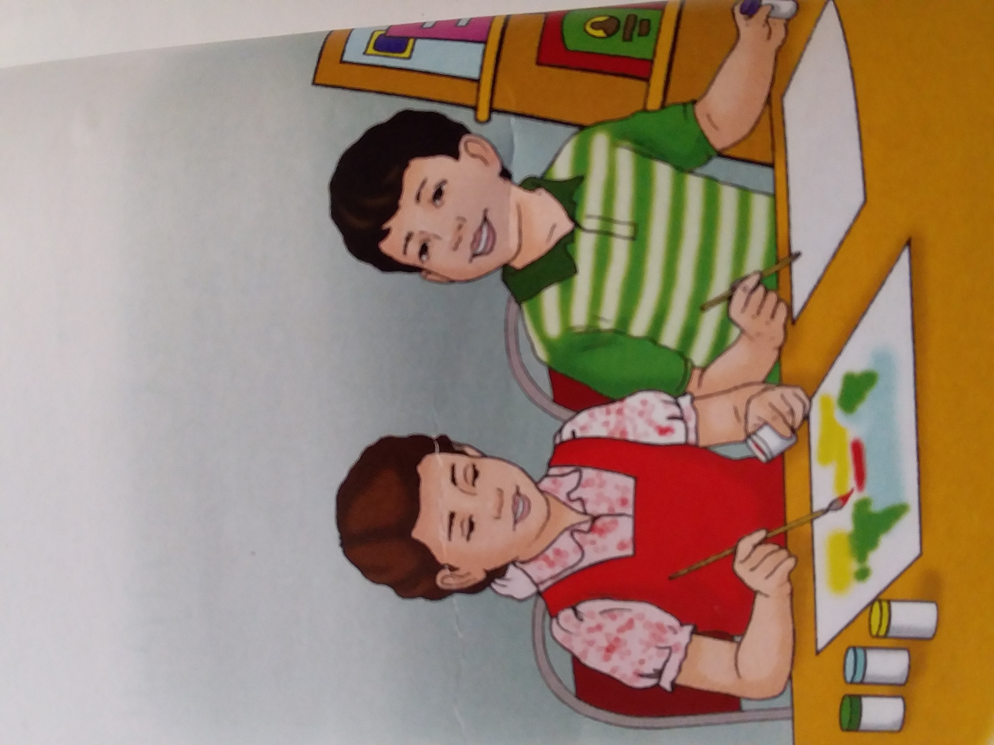 На картинке мальчик и девочка . Девочка уже почти нарисовал. А мальчик только начинает. Потому что у него ещё белый листок. Мы видим что девочка использует красные,белые,зелёные и жёлтые краски.Девочка одета в красный наряд,а мальчик в зелёный.