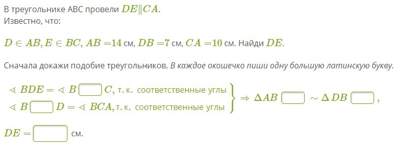 Треугольники АВС и DBE подобны по двум углам с коэффициентом k=АВ/DB = 14/7 = 2. Из подобия имеем: DE = AC/2 = 10/2 = 5 см.