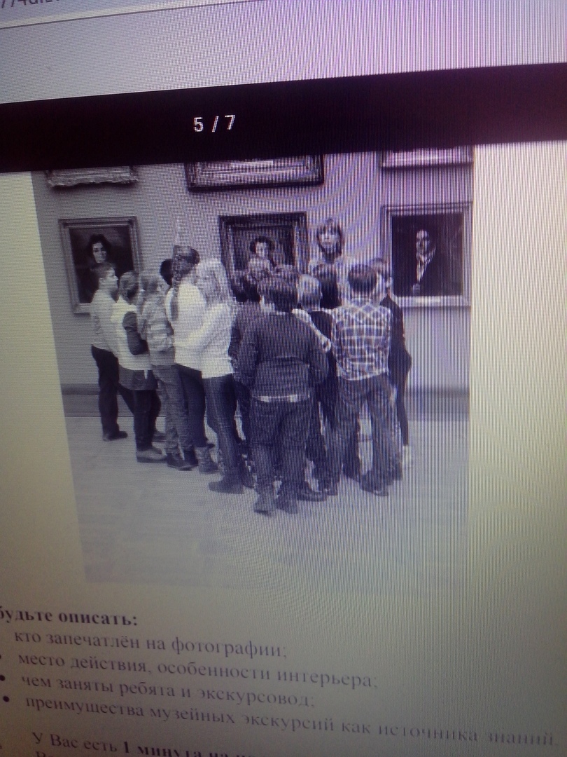 это экскурсия школьников.они пришли в музей. на стенах картины. экскурсовод что- то рассказывает. дети внимательно слушают. некоторые отвлекаются.наверное,им не интересно. в музее светло и чисто. дети одеты тепло,значит на улице зима или осень. в музеях можно узнать много интнресного- жаль,что редко там бываем.