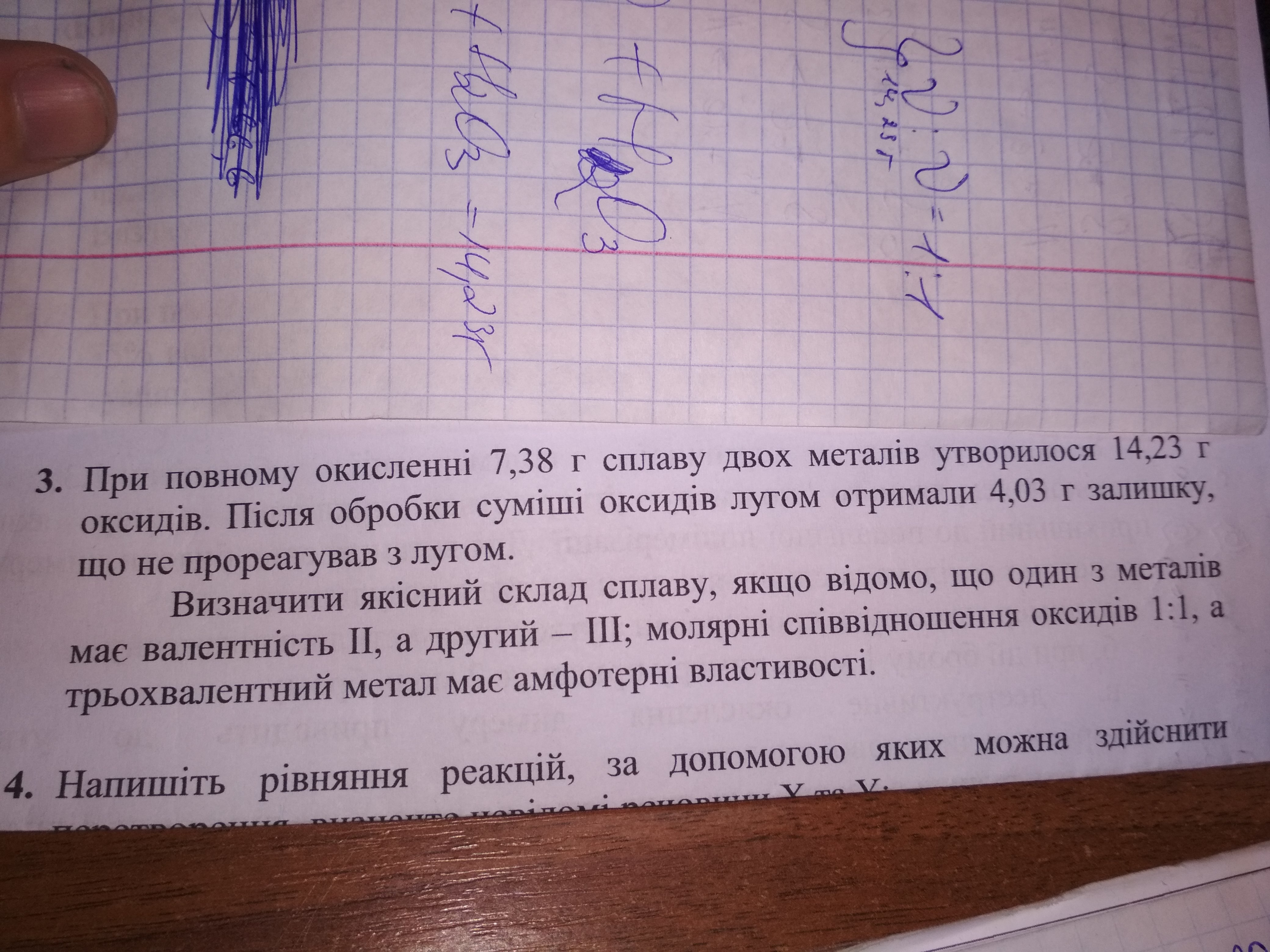 При полном окислении сплава из двух металлов 7.38 гр сплава получилось 14.23 гр оксидов. После обработки смеси оксидов щелочью получили 4.03 гр остатка, что не прореагировал с щелочью.
