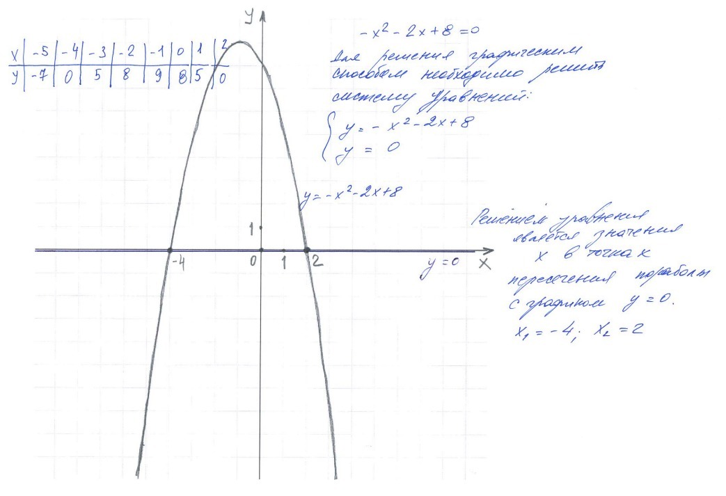 Решите графически уравнение -х^2 - 2х + 8=0, если можно то с рисунком пожалуйста.
