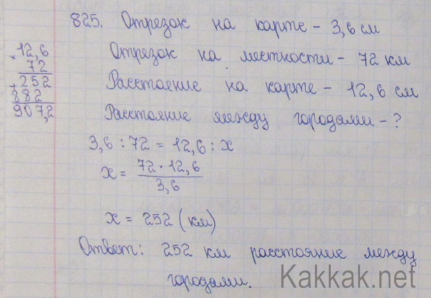 На карте отрезку длиной 3,5 см соответствует на местности 72 км расстояния. Какое расстояние между двумя городами на местности, если расстояние между ними на карте 12,6 см?
