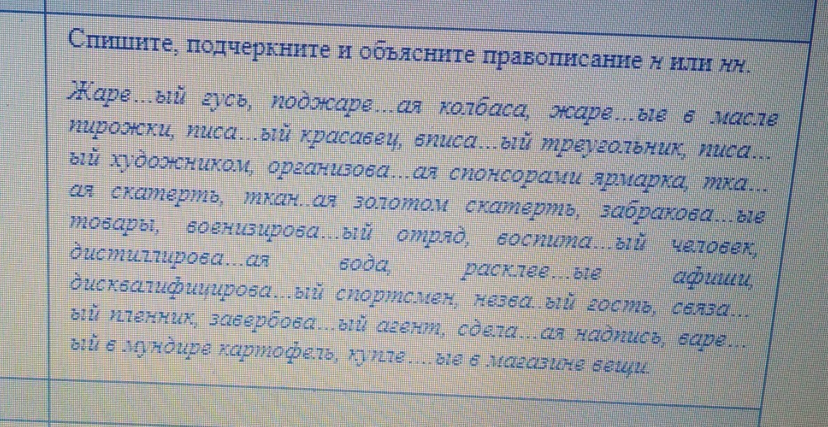 Жареный гусь, поджаренная колбаса, жареные в масле пирожки, писанный красавец, вписанный треугольник, писаный художником, организованная спонсорами ярмарка, тканая золотом скатерть, забракованные товары, военизированный отряд, воспитанный человек, дистиллированная вода, расклеенные афиши, дисквалифицированный спортсмен, незваный гость, связанный пленник, завербованный агент, сделанная надпись, варёный в мундире картофель, купленные в магазине вещи.