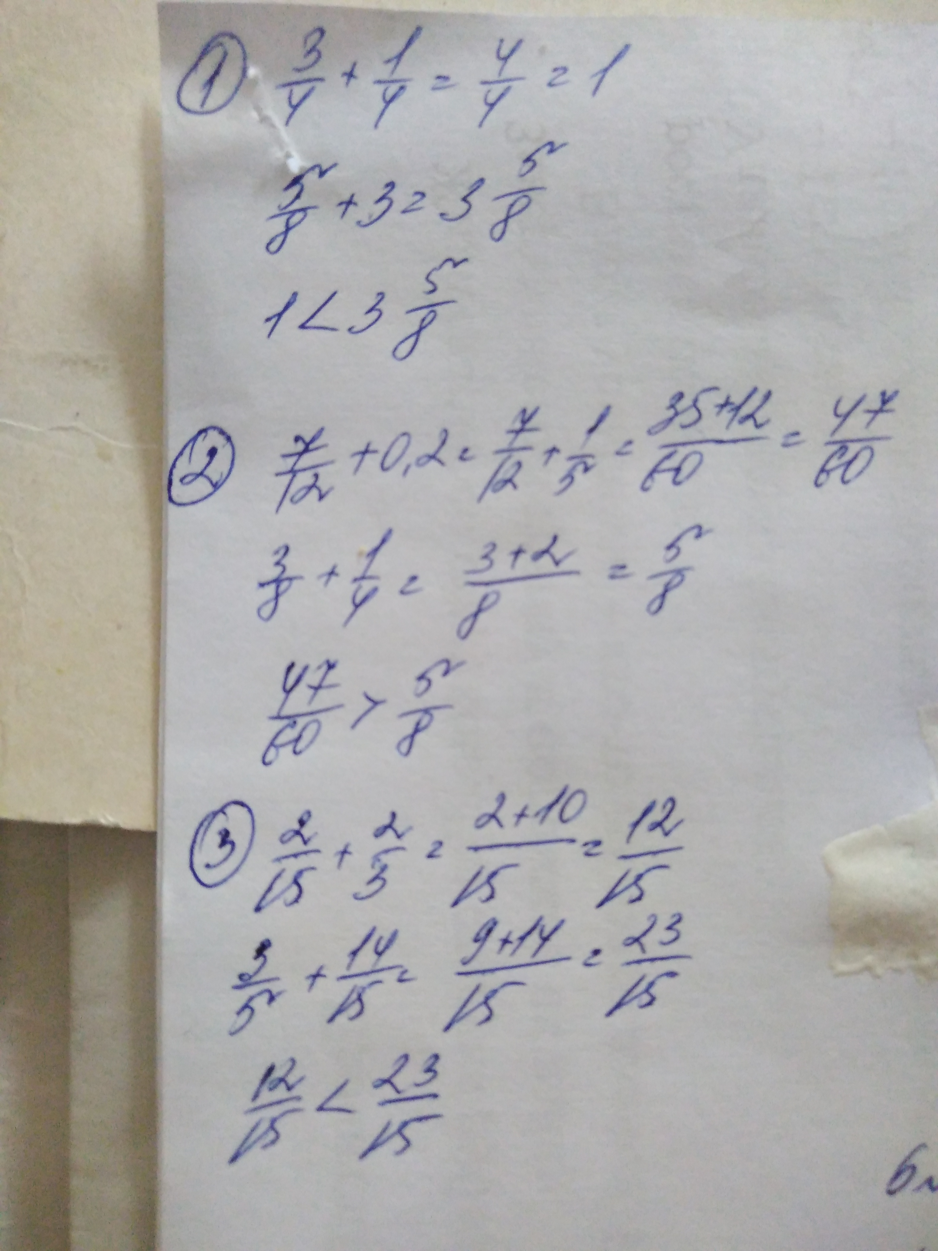Выполните почленное сложение неравенств: 1) 3/4>5/8 и 1/4<3 2) 7/12>3/8 и 0,2<1/4 3) 2/15<3/5 и 2/3<14/15