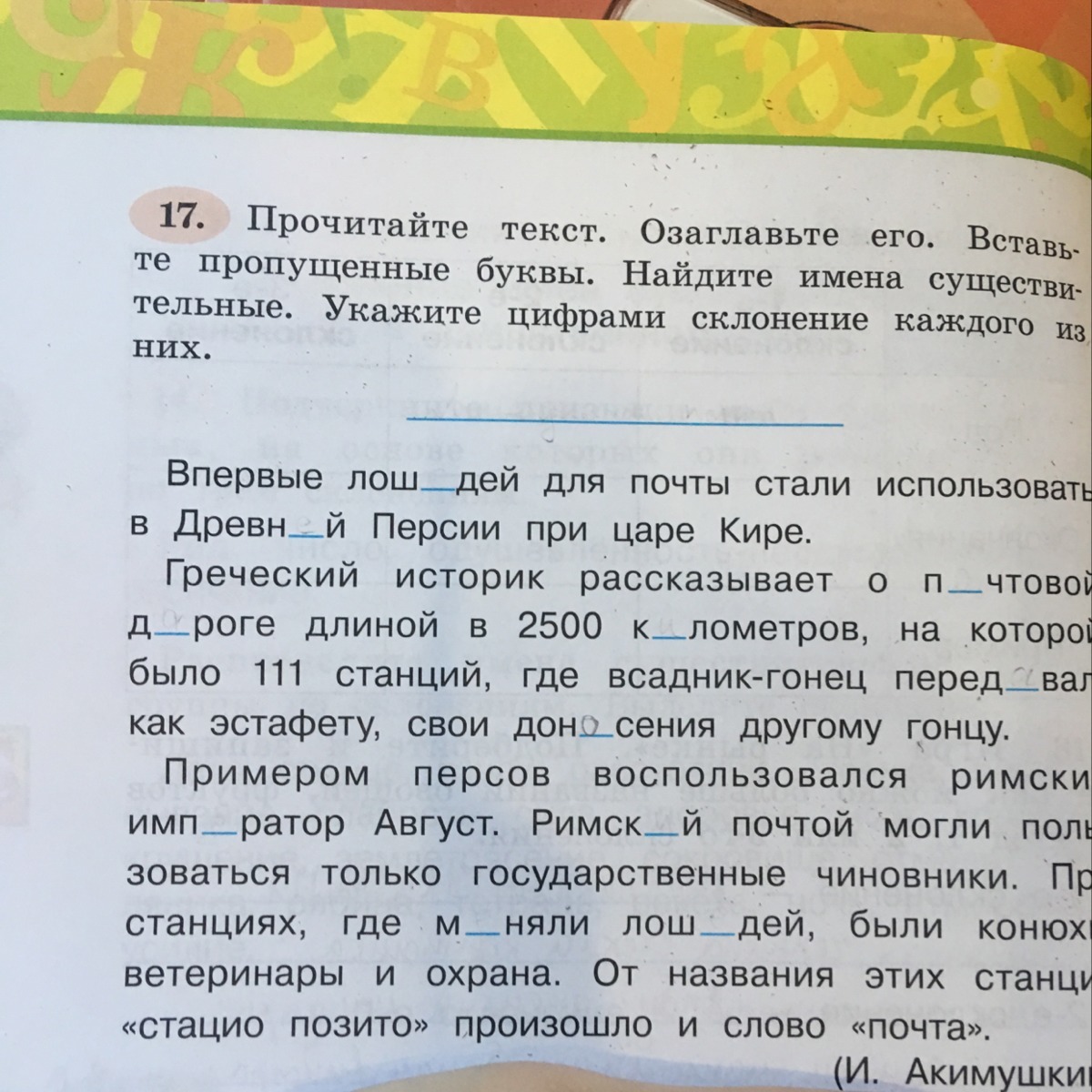 Прочитайте текст. Озаглавьте его. Вставьте пропущенные буквы. Найдите имена существительные. Укажите цифрами склонение каждого из них.