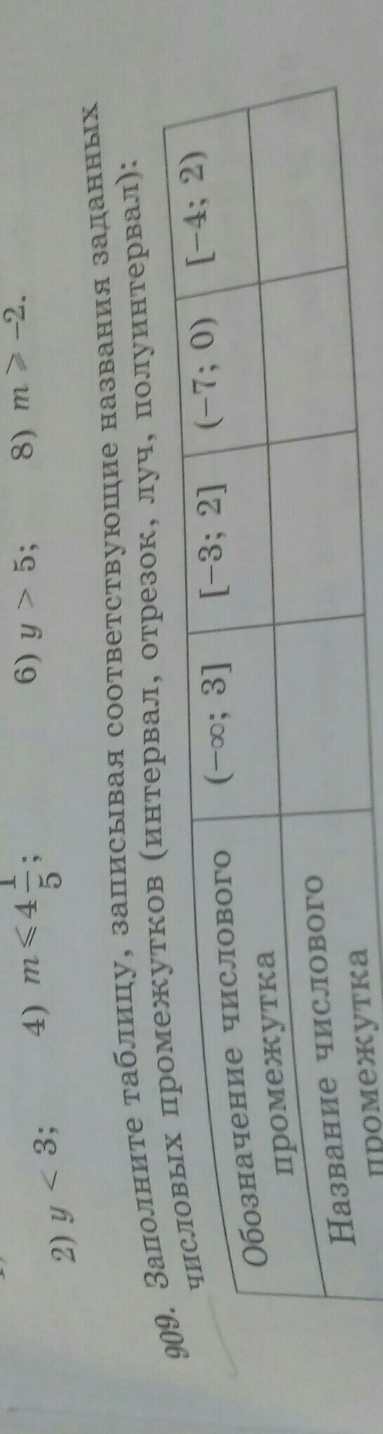 Заполните таблицу записывая соответствующее название заданных числовыми промежутками интервал отрезок луч полуинтервал