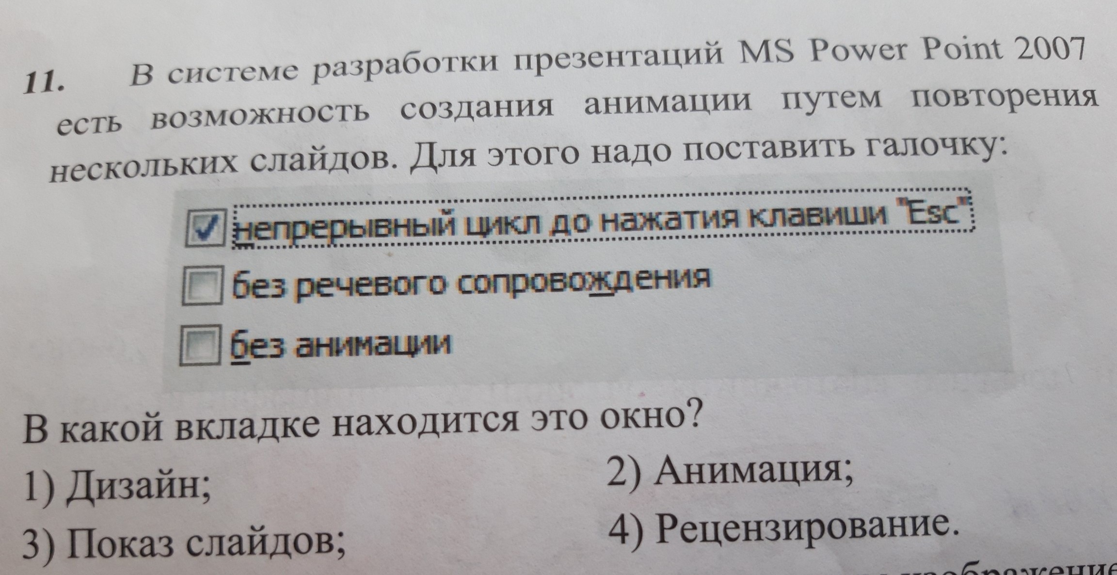 В системе разработки презентации MC PowerPoint 2007 есть возможность создания анимации путем повторения нескольких слайдов . Для этого надо поставить галочку : В какой вкладке находятся это окно? 1дизайн 2анимация 3 показ слайдов 4 рецензирование
