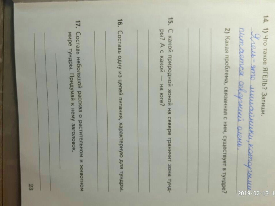 2)Нарушение почвенного покрова, перевыпас, промышленные разработки, строительство дорог. Зимой его не видно. 15. По северу проходит граница между тундрой и арктическими пустынями, а по югу с тундра граничит с зоной тайги. 16.карликовая берёза - заяц - песец -волк. 17. Растения и животные