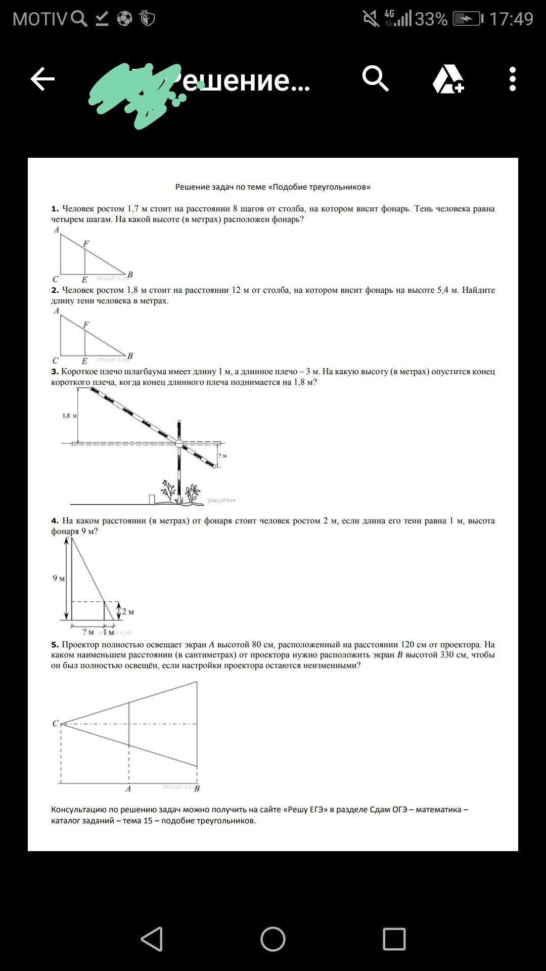 4. Задача, подобная первой. Находим коефициент подобия: 9/2=4,5. Расстояние до фонаря равно разнице основания большого и малого треугольника: 4,5 · 1 - 1=3,5 м