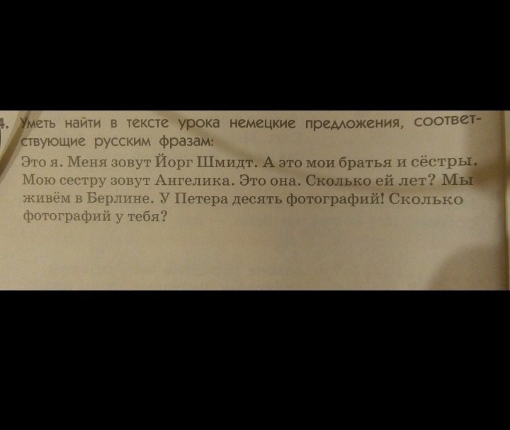 Das bin ich. Ich heiße Jörg Schmidt. Und das sind meine Geschwister. Meine Schwester heißt Angelika. Das ist sie. Wie alt ist sie? Wir wohnen in Berlin. Peter hat 10 Fotos. Wie viele Fotos hast du?