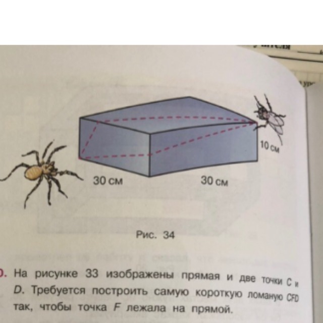 В двух противоположных углах коробки сидеть мужа и паук(рис 34).паук может двигаться к мухе кратчайшим путём две способами:по двум боковым граням тли сначала по боковой,потом по верхней грани.Какой из этих путей короче?