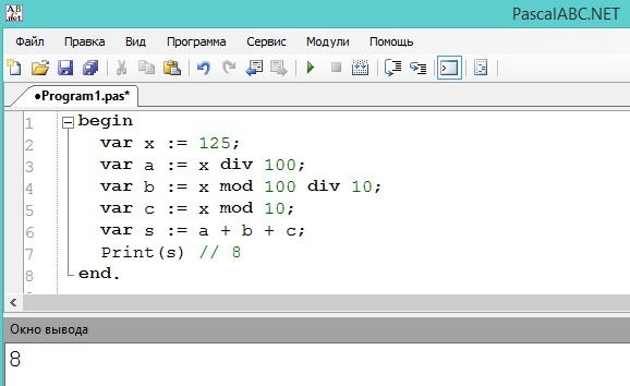 Помогите пожалуйста. Срочно нужно a := x div 100 b := x mod 100 div 10 c := x mod 10 s := a+b+c x = 125 s = ?