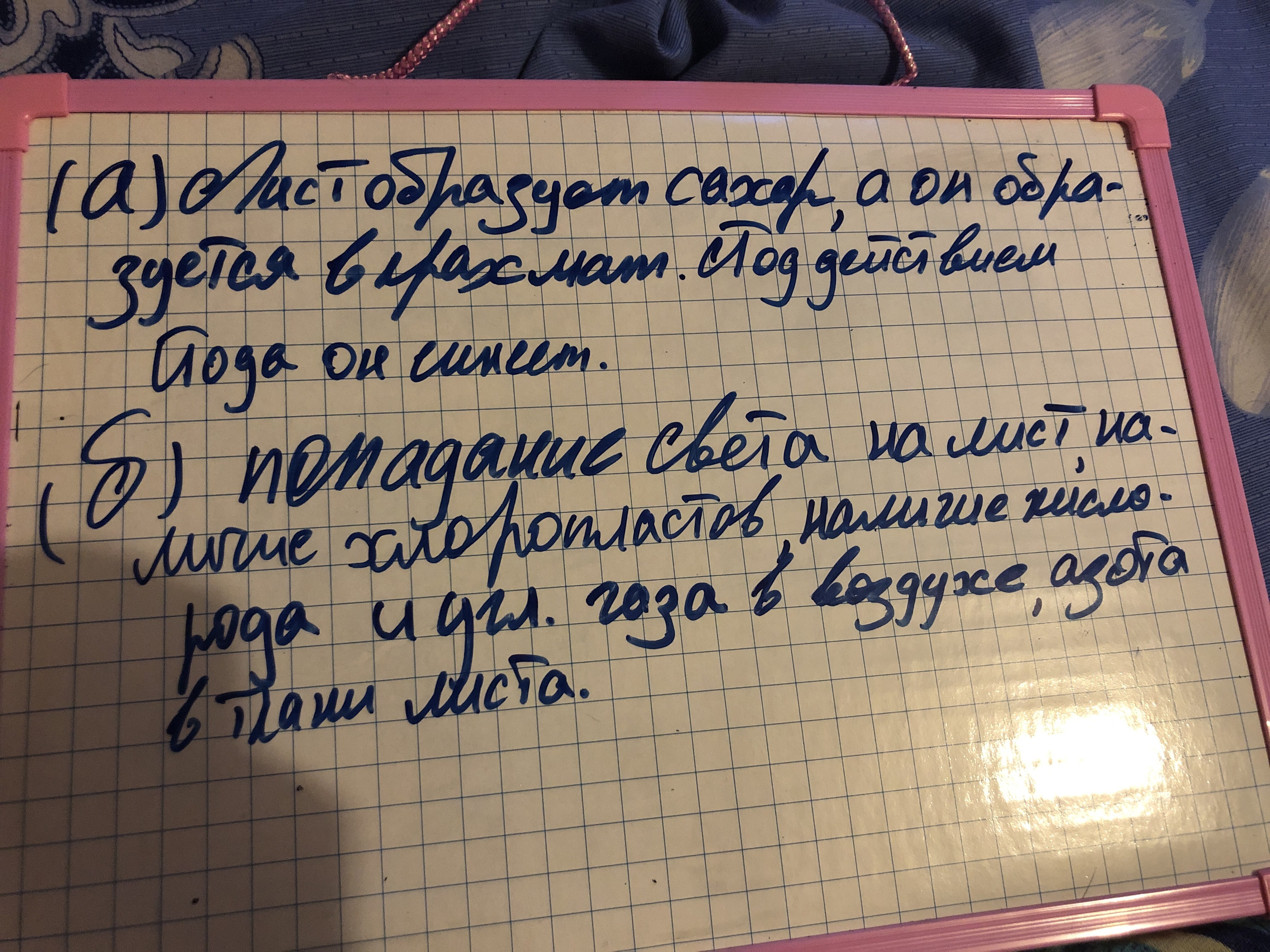 - На рисунке Второй (белый) лист - это обычный лист, который сначала опустили в кипяток, а потом в горячий спирт. Этим разрушили хлоропласты, в которых за время отосинтеза накопился крахмал. теперь мы его высвободили.