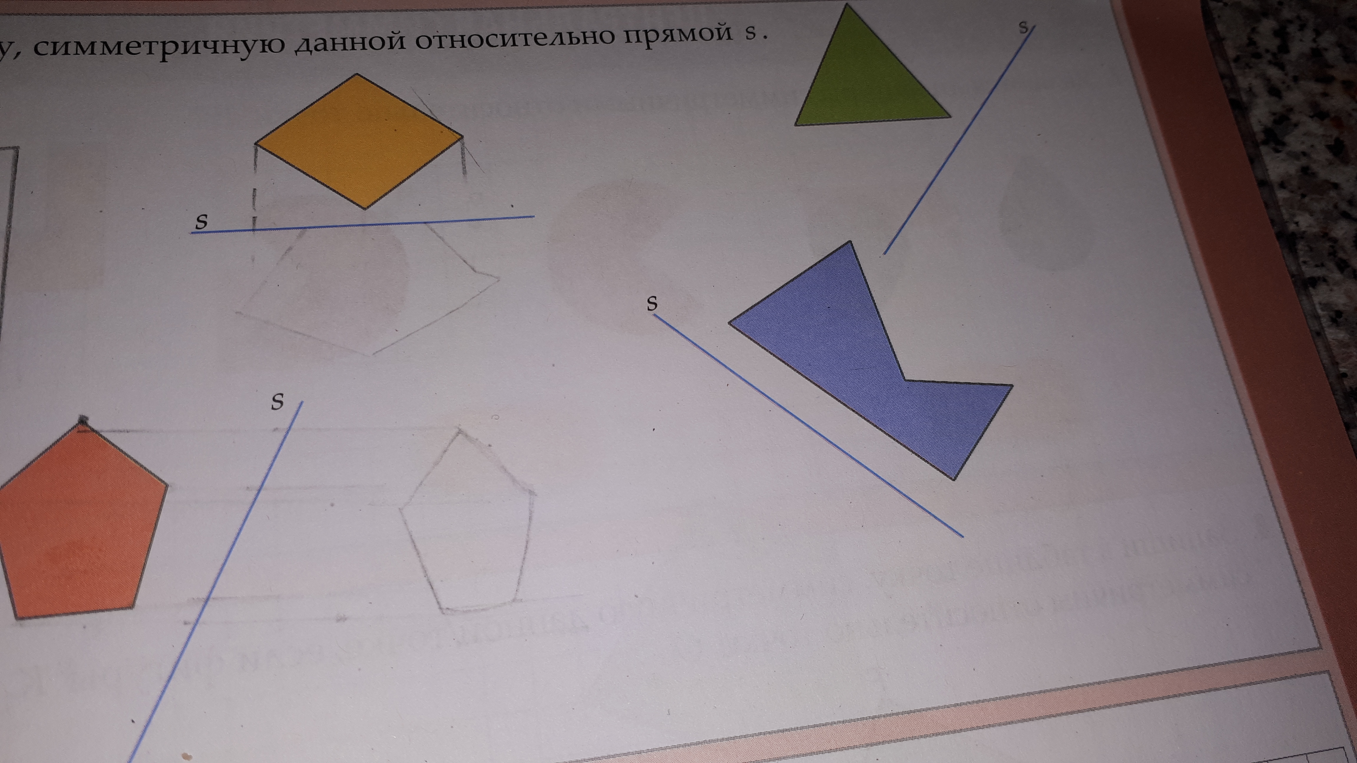 бери линейку и от каждого угла делай перпендикуляр к прямой потом продливаешь эту линию с другой стороны потом измеряешь растояние от угла до прямой и это же растояние и на этом растоянии ставь точку все также с другими углами а потом соеденить их