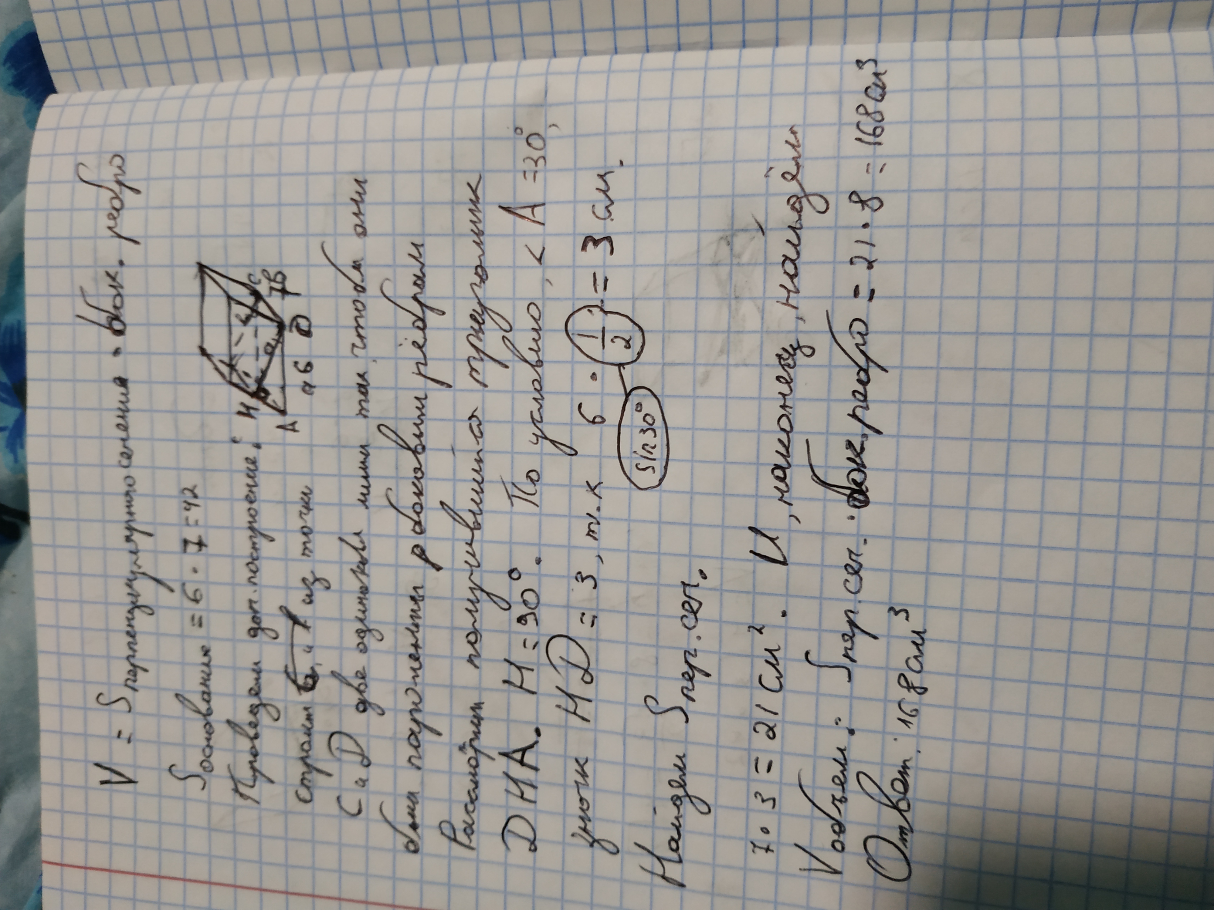 Основанием наклонной призмы является прямоугольник со сторонами 6 см и 7 см, а боковое ребро равно 8 см и образует с плоскостью основания угол 30 градусов. Чему равен объём этой призмы?