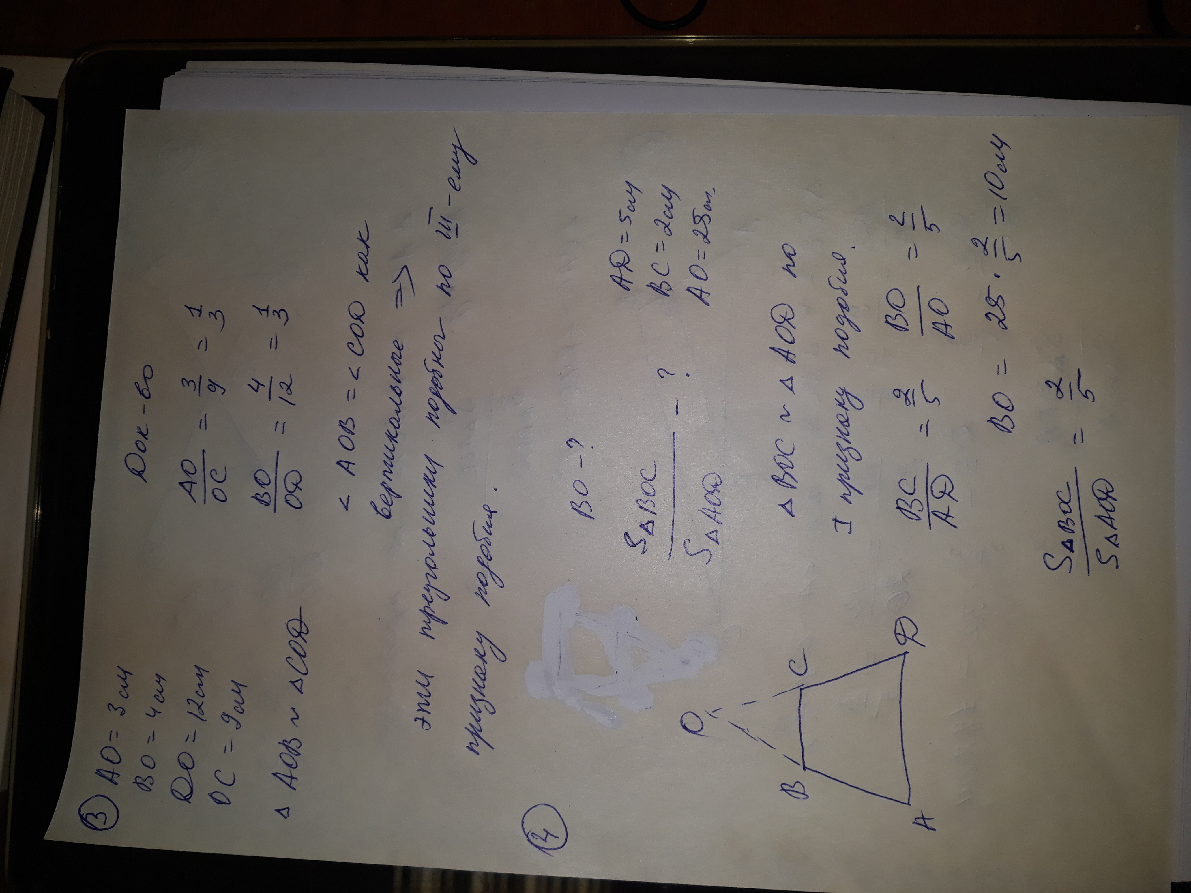 4. Продолжение боковых сторон трапеции АВСD пересекаются в точке О. Найдите ВО и отношение площадей треугольника ВОС и АОD. Если AD = 5см, ВС = 2см, АО = 25см.