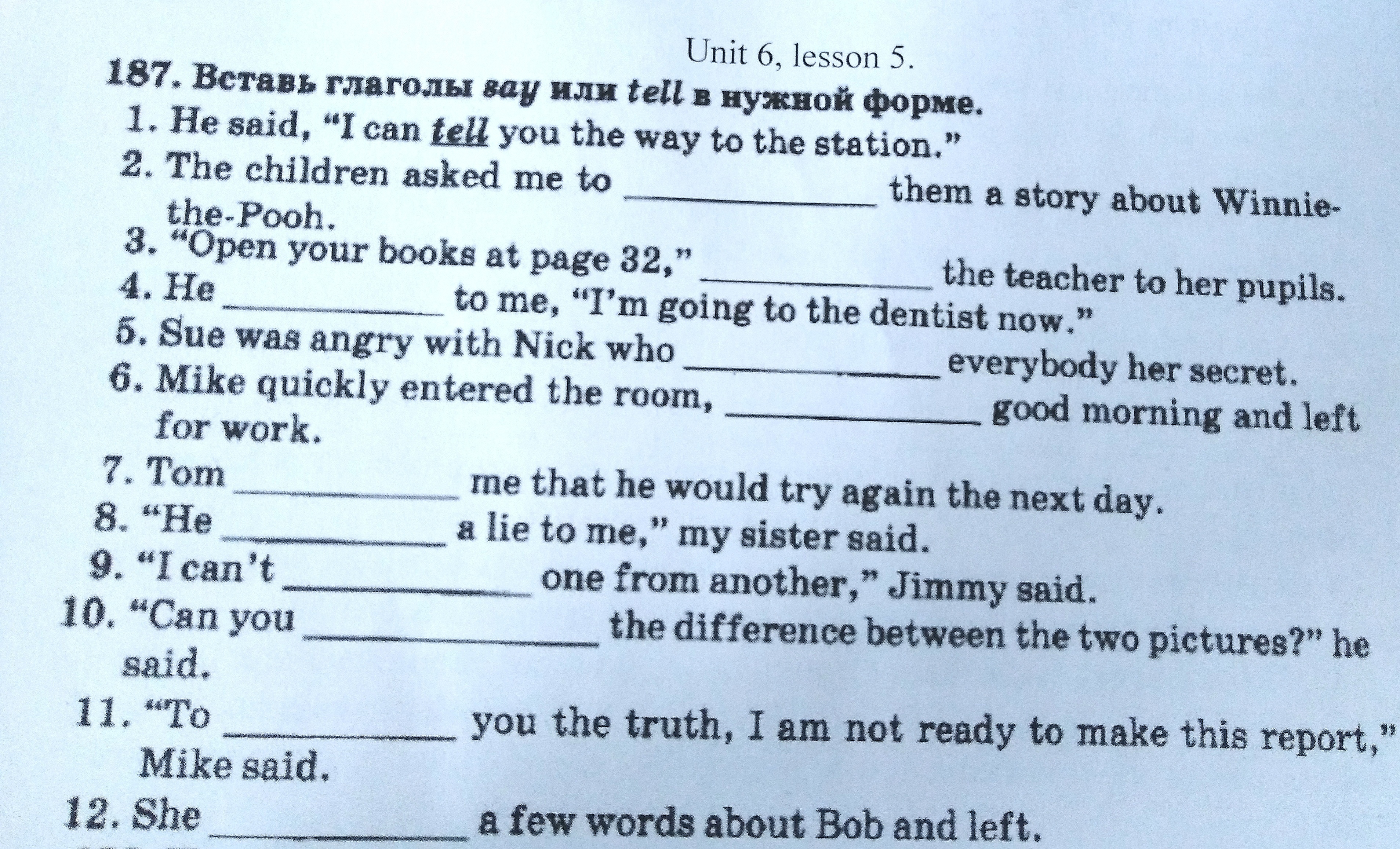 2 - tell, 3 - said, 4 - said, 5 - told, 6 - said, 7 - told, 8 - told, 9 - tell, 10 - tell, 11 - tell, 12 - said