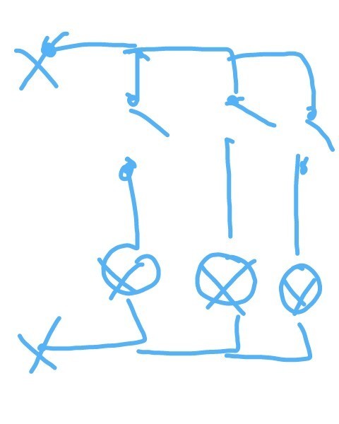 Ребят помогите пожалуйста Нарисовать схему соединения ламп накаливания 3 шт. так чтобы они включались : а) одновременно, причем одним ключем; б) все раздельно (возможно применить несколько ключей