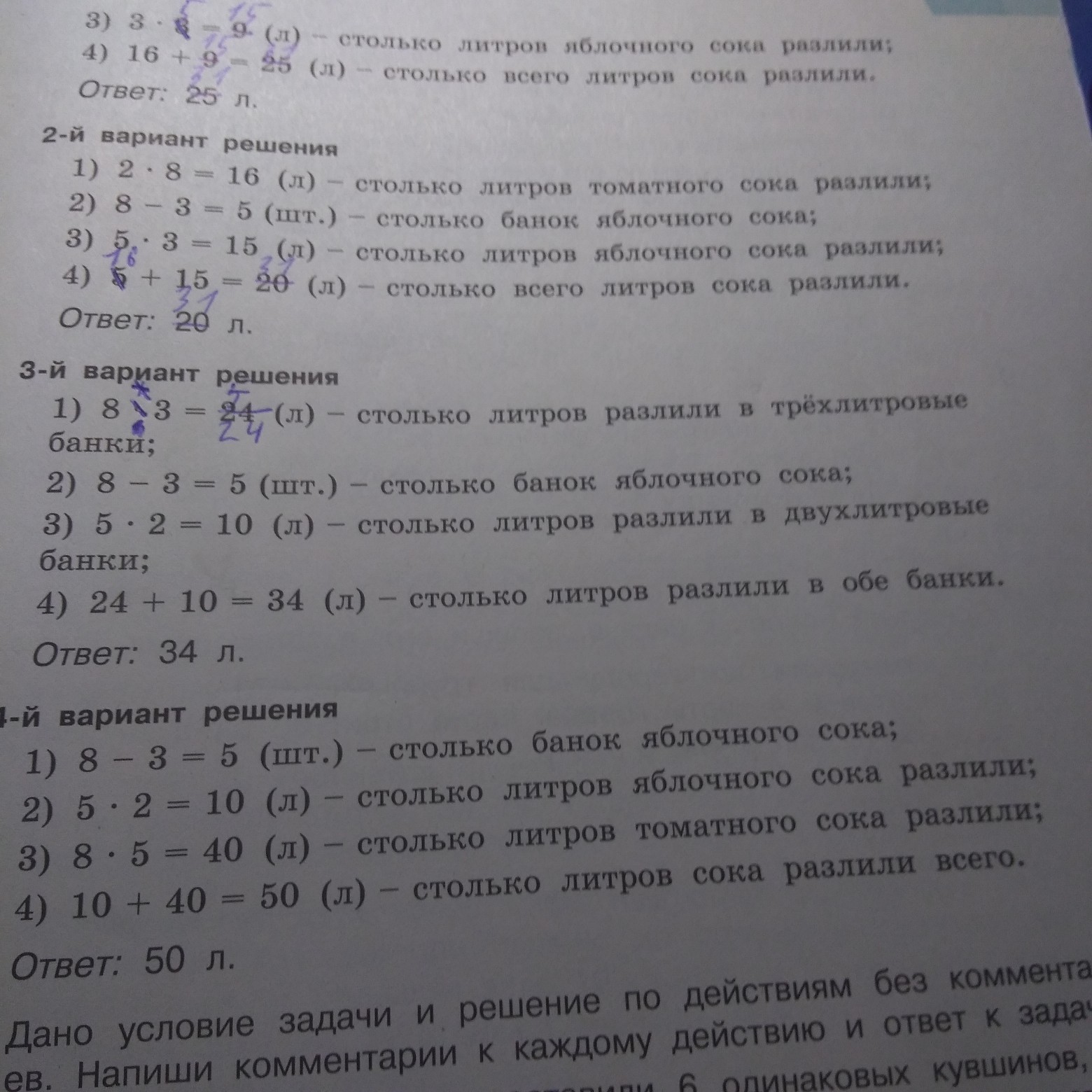 Помогите пж даю 10 баллов. Томатный сок разлить по двухлитровым банкам,а яблочный по трёхлитровым.Двухлитровым банок получилось 8,а трёхлитровым-на 3 меньше.Сколько всего литров сока разбили? Найдите ошибки в 3-м варианте и 4-ом пж