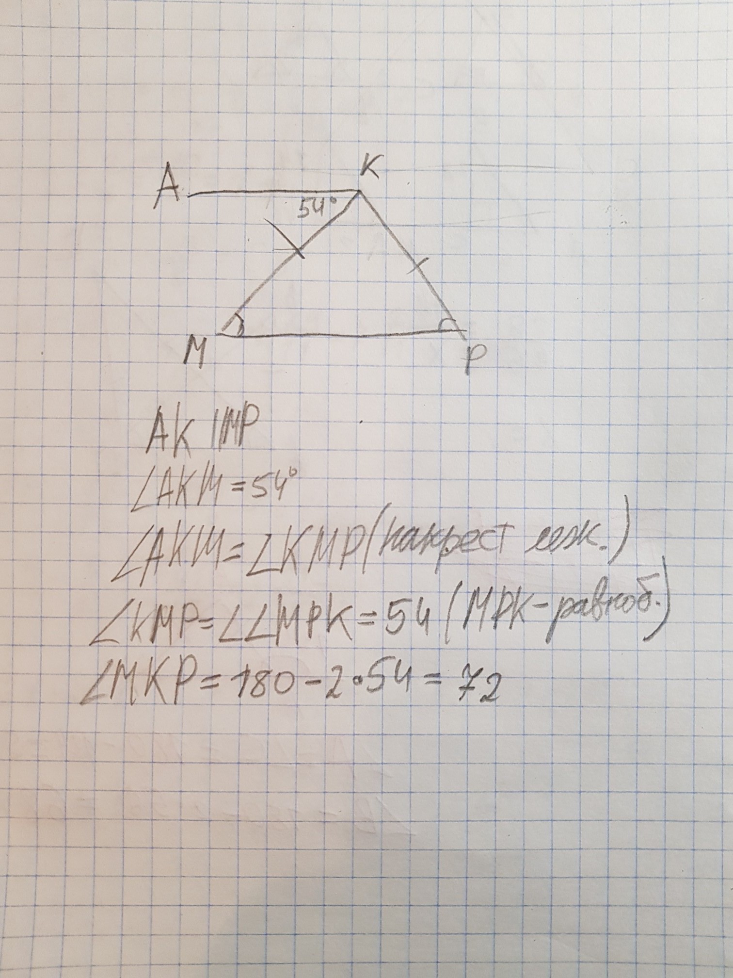 найдите углы равнобедренного треугольника MKP с основанием MP если прямая AK пораллелен на оснаванию MP угол AKM равен 54°