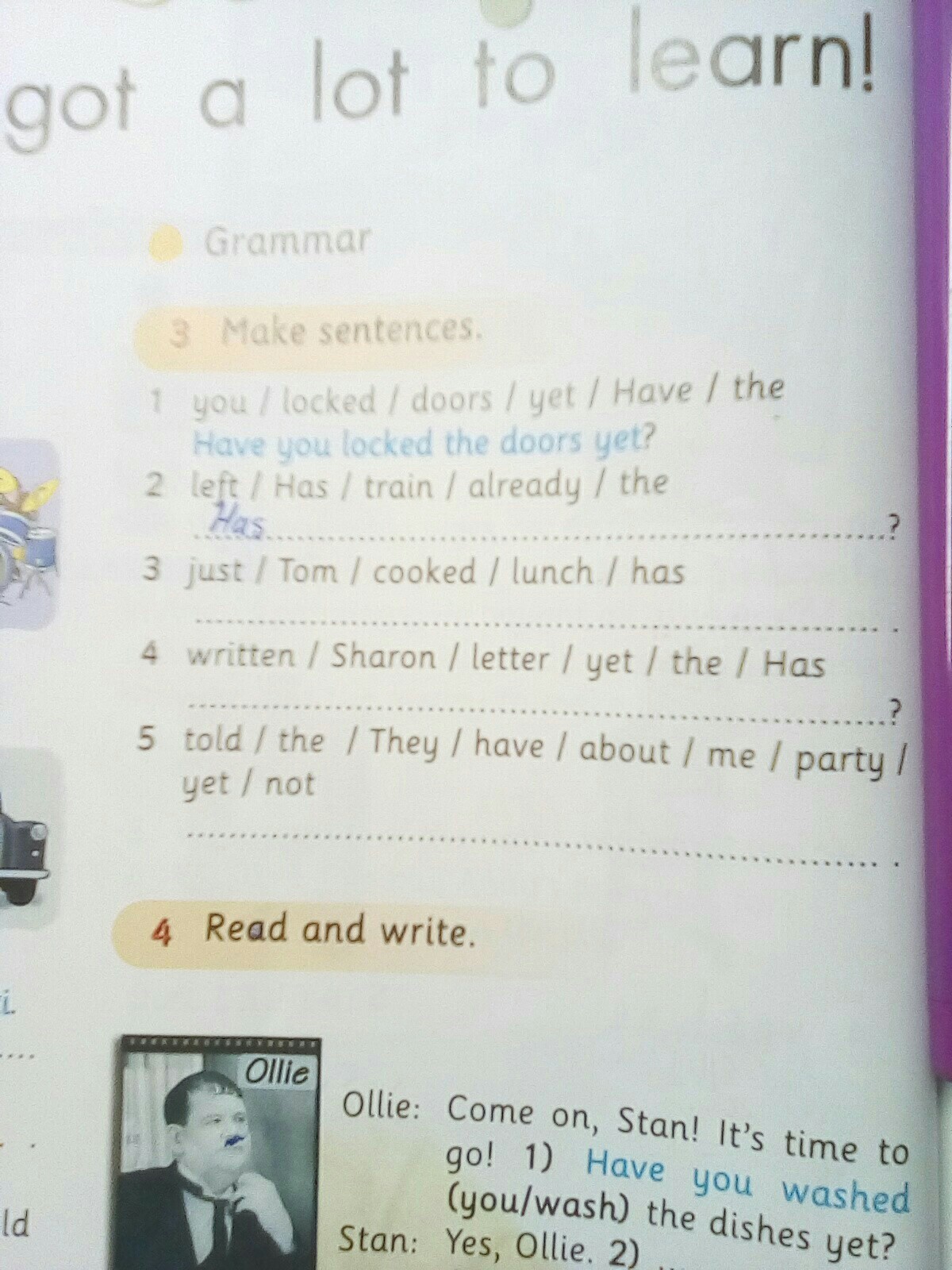 2 - has the train left already, 3 - tom has just cooked lunch, 4 - has sharon written the letter yet, 5 - they have not told me about the party yet