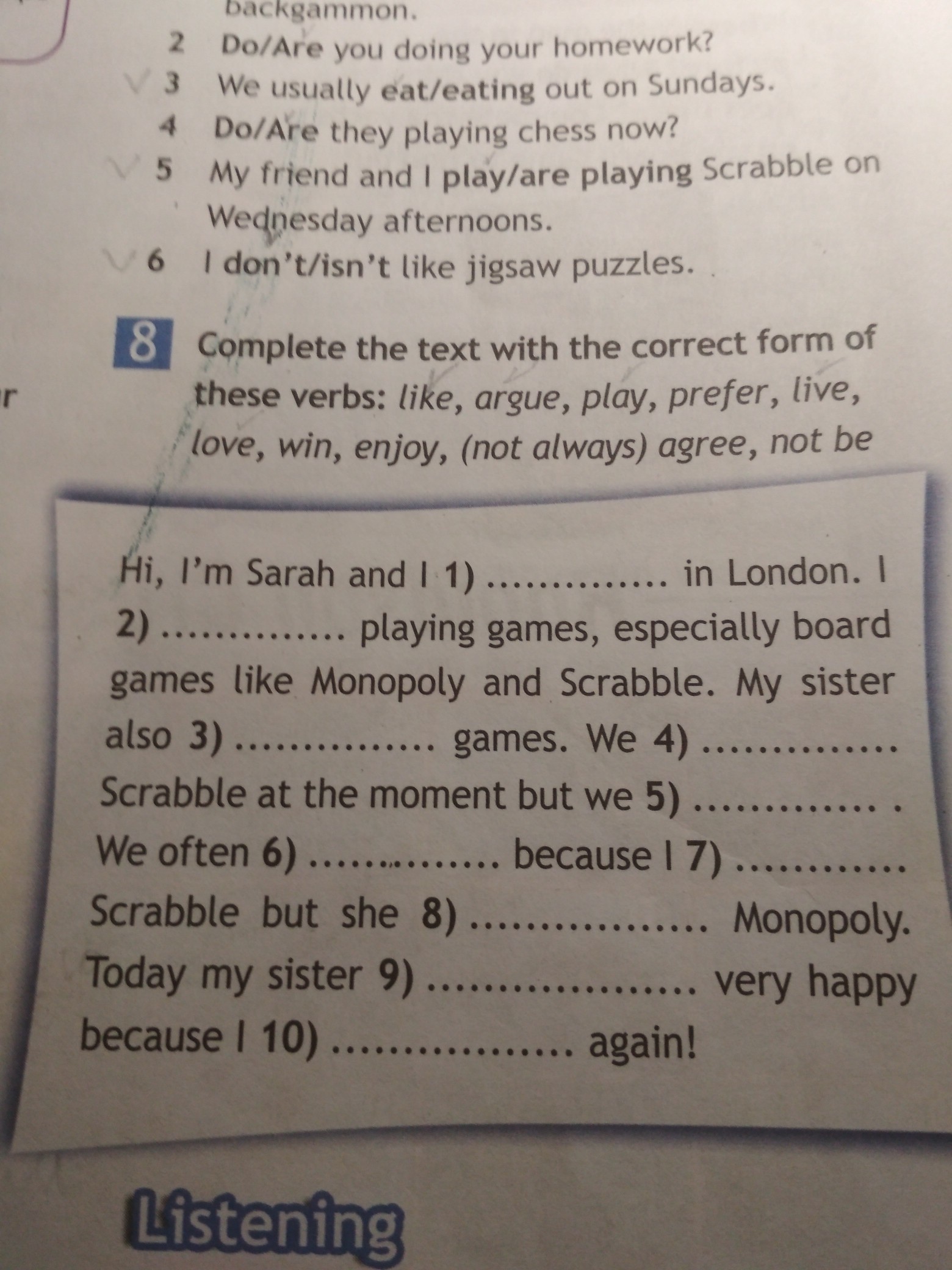 1 - live, 2 - love, 3 - likes, 4 - are playing, 5 - don't always agree, 6 - argue, 7 - enjoy, 8 - prefers, 9 - wasn't, 10 - won