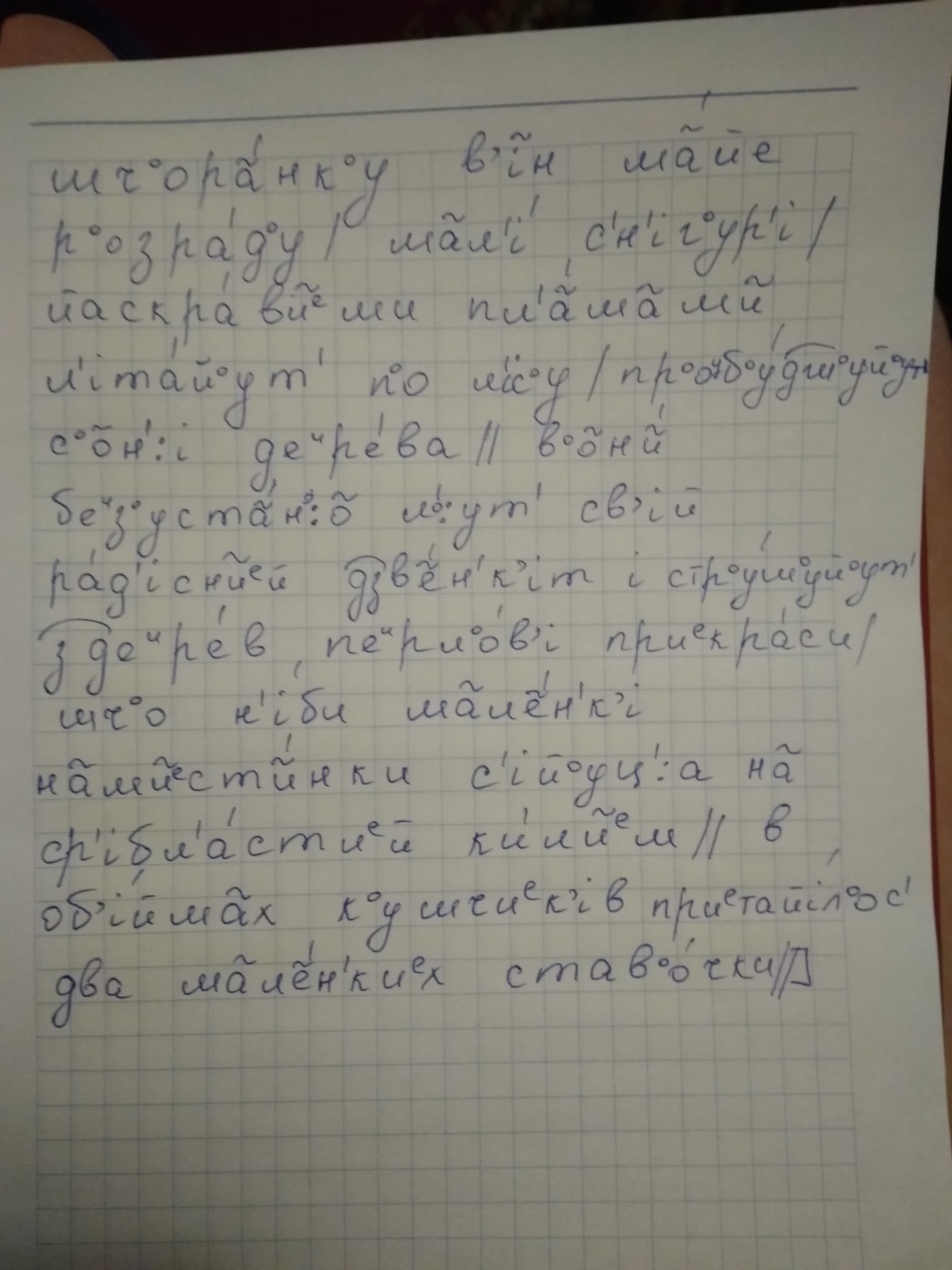 Зима... Срібний ліс потонув у сніжному океані, що так і нагорта на нього кожного дня сиві хвилі метелиці. А коли ще й вітер почне сердитися, то крижані, свинцеві гребні, ніби справжні ланцюги, сковують кожний порух гілочок. Так і стоїть ліс понурий і холодний, лише іноді сонечко визирає з-поза хмар і звеселяє природу. Майже всі пташки покинили його у самоті. Але щоранку він має розраду - малі снігурі, яскравими плямами літають по лісу, пробуджують сонні дерева. Вони безустанно ллють свій радісний дзвенькіт і струшують з дерев перлові прекраси, що ніби маленькі намистинки сіються на сріблясий килим. В обіймах кущиків притаїлось два маленьких ставочки