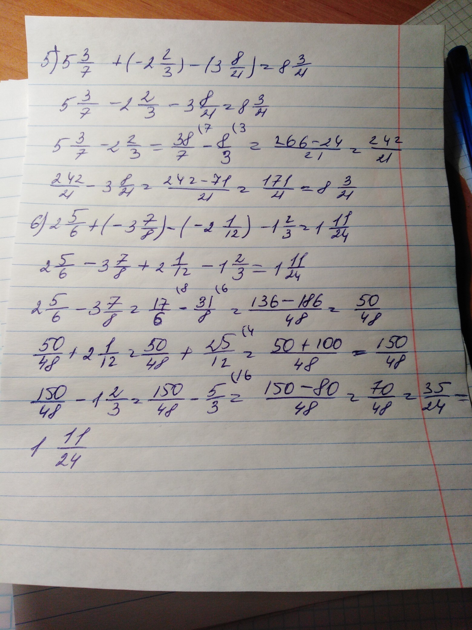 5)5 3/7+(-2 2/3)-(3 8/21)